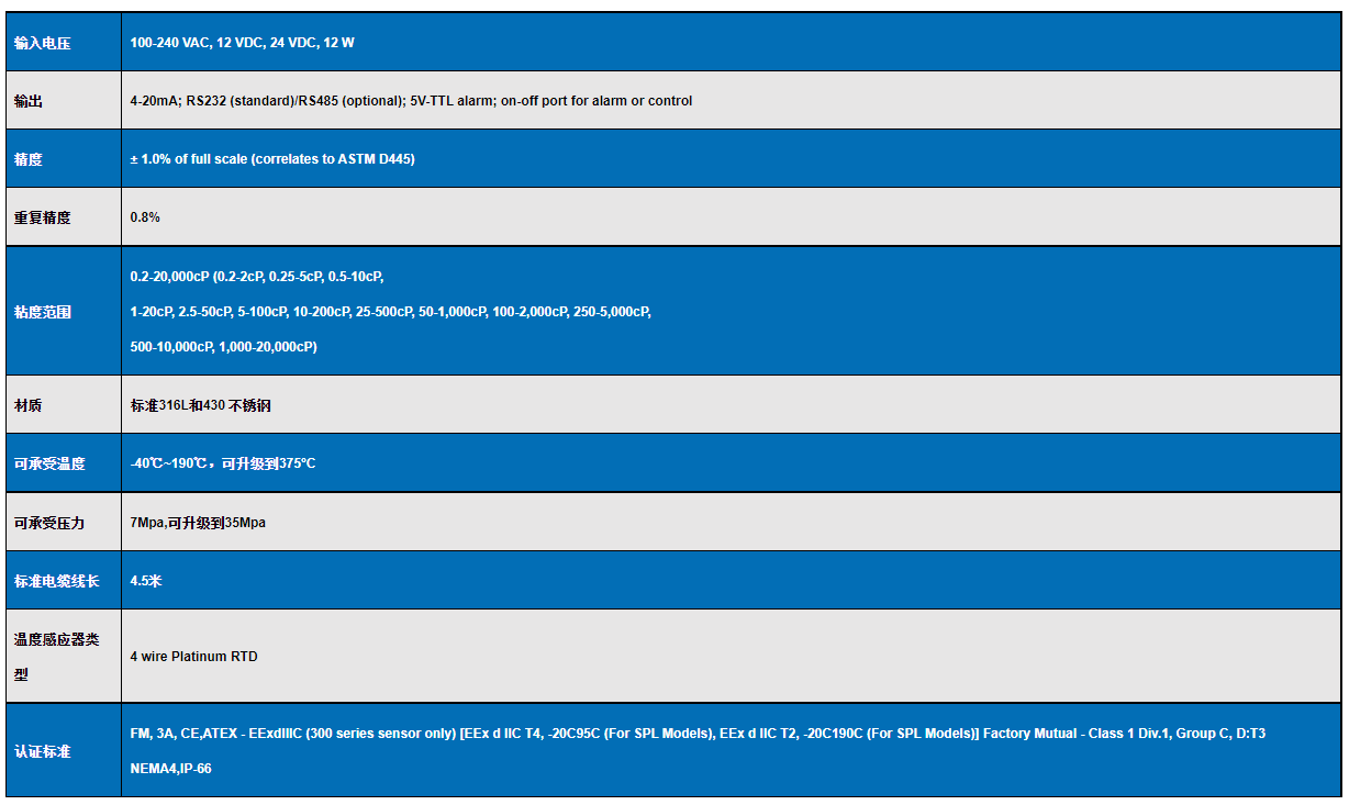 VISCOpro2000 在線粘度計規(guī)格參數(shù):
