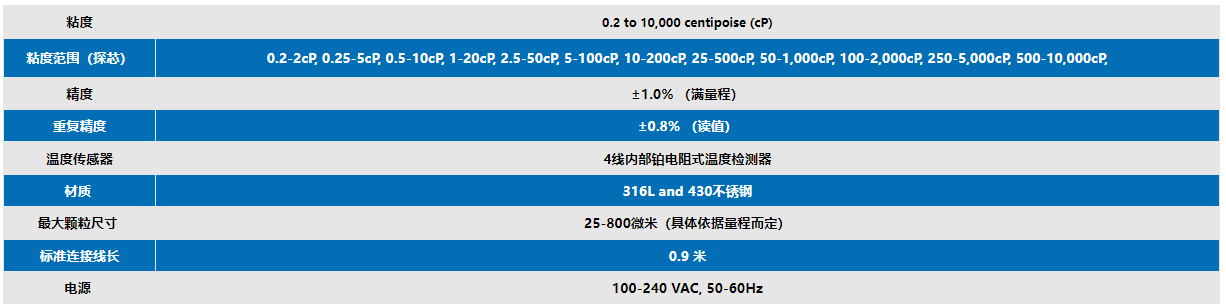 可在12個(gè)20:1粘度范圍內(nèi)進(jìn)行測(cè)量。粘度可顯示為CP或CST,溫度可顯示為°C或°F。集成溫度控制允許用戶在高于環(huán)境溫度至356°F(180°C)和高于環(huán)境溫度至-40°C的任意設(shè)置下進(jìn)行測(cè)量,并配備可選的冷卻套。該傳感器易于現(xiàn)場(chǎng)校準(zhǔn)。可以預(yù)先校準(zhǔn)多個(gè)工作范圍和產(chǎn)品設(shè)置。