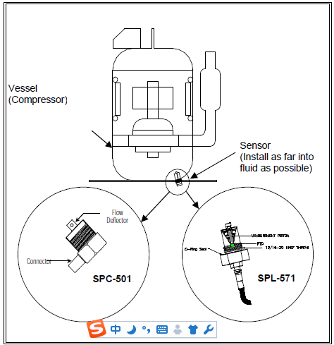 2,如果使用可選的1/2NPT美制適配器,用生膠帶纏繞螺距和螺紋部分,這部分將傳感器裝到壓縮機上。